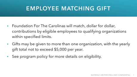 Foundation for the Carolinas will match on a dollar-for- dollar basis eligible employee’s gifts of $25 or more to a qualified charitable organization. The maximum matched for any one employee per year is $5,000.