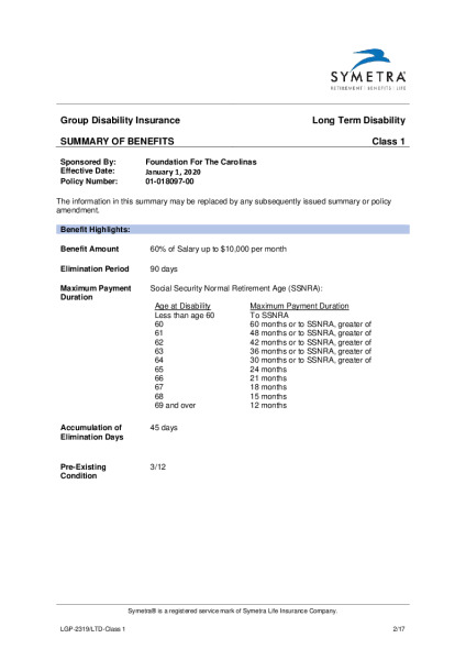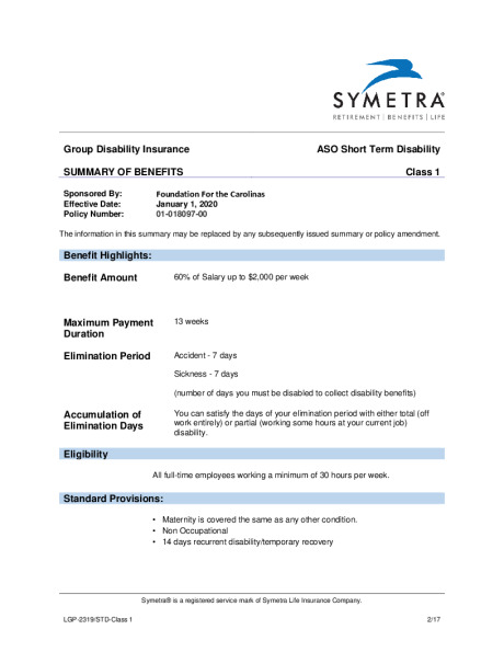 Foundation For The Carolinas provides regular  employees who work 30 hours or more per week a  Long-Term Disability policy.
